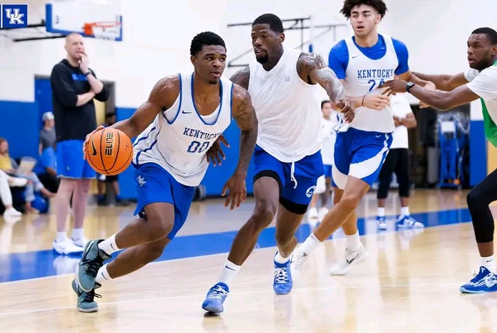 A scramble near midcourt. Two bodies hit the floor. And just when the ball looked lost — Quaintance launched himself across the hardwood like it was Game 7, ripped it free, spun to his feet, and zipped a pass to the corner. Swish. Three. Practice stopped.