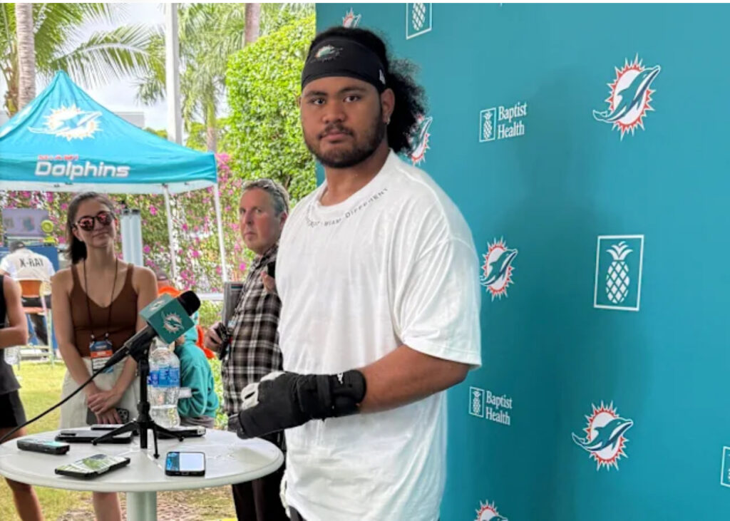 MIAMI GARDENS — Miami Dolphins rookie guard Jonah Savaiianaea has been jamming with quarterback Tua Tagovailoa.